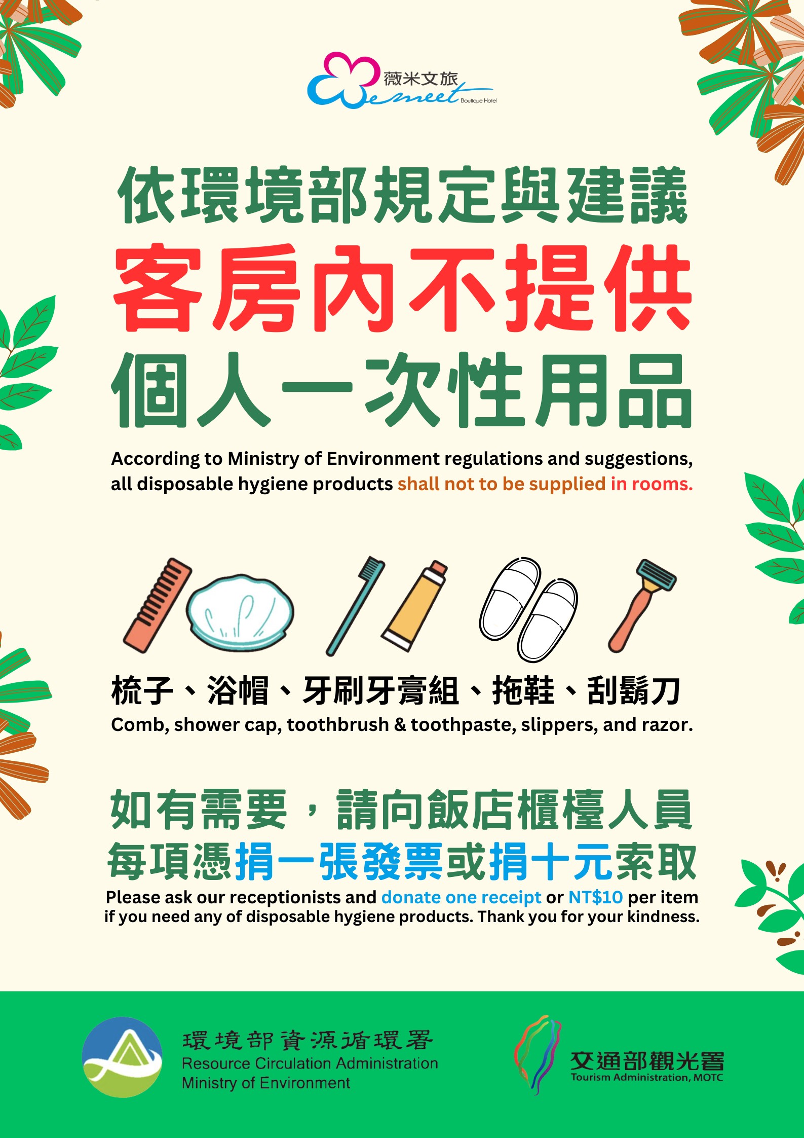 依環境部規定,客房內不提供一次性個人用品 (牙刷牙膏組、刮鬍刀、浴帽、梳子、拖鞋等),如有需要,可向櫃檯人員每項憑捐一張發票或捐 10 圓索取。