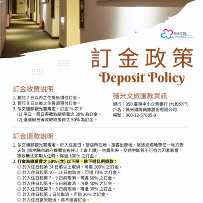 - 退房時間為上午 11:00 以前,延後退房 NT$100 / 半小時,最晚須於 13:00 退房。若需要延後至超過 13:00 退房,需酌收退房當日之整天房費。