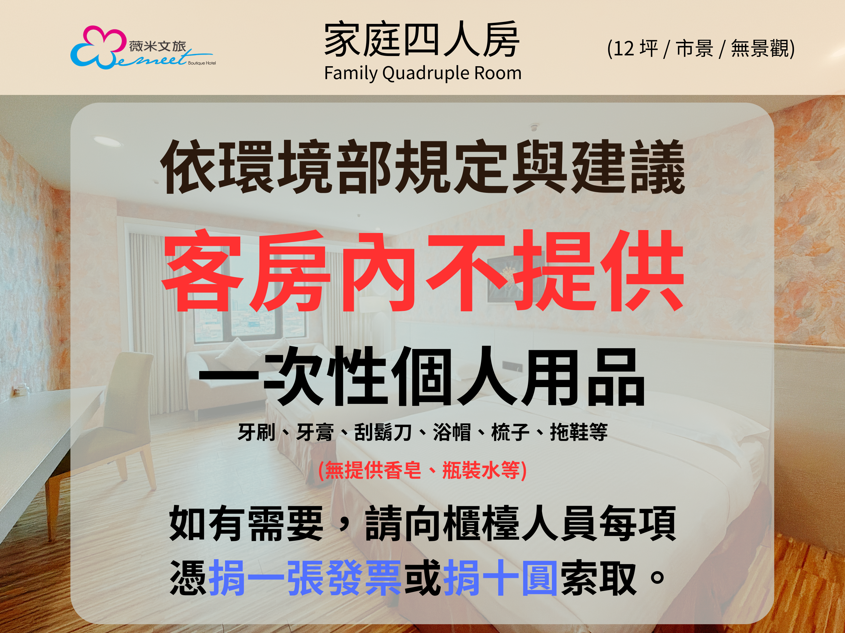依環境部規定,客房內不提供一次性個人用品 (牙刷牙膏組、刮鬍刀、浴帽、梳子、拖鞋等),如有需要,可向櫃檯人員每項憑捐一張發票或捐 10 圓索取。