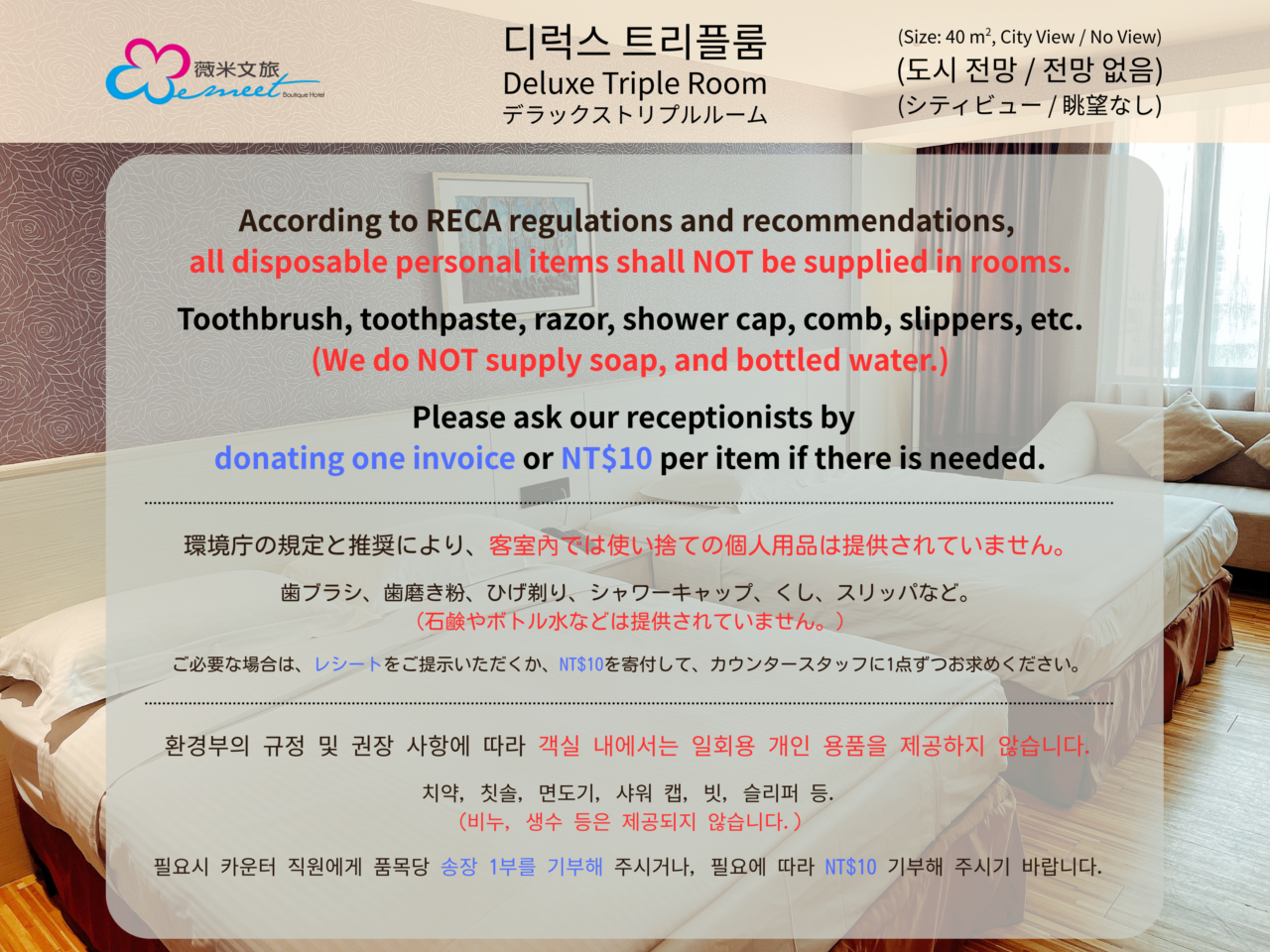 依環境部規定,客房內不提供一次性個人用品 (牙刷牙膏組、刮鬍刀、浴帽、梳子、拖鞋等),如有需要,可向櫃檯人員每項憑捐一張發票或捐 10 圓索取。